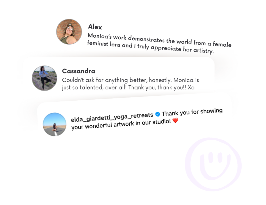 Outside the canvas, Monica has been practicing yoga for over fourteen years and is currently training to become a yoga instructor. She also holds a double degree in Art and Accounting, a combination that reflects both her practical roots and her refusal to abandon what she loves.